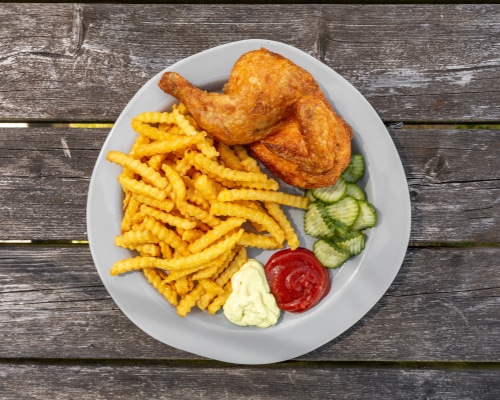 Friturestegt kylling med pommes fritesSprød og saftig friturestegt kylling serveret med gyldne pommes frites, ketchup, remoulade og en frisk hjemmelavet agurkesalat – den perfekte kombination af sprødt, sødt og syrligt.
