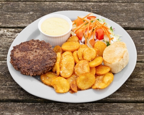 Plankebøf serveres med flade kartofler og bearnaise sovs. Dertil får du salat som tilbehør bestående af bl.a. ærter, majs, tomat, agurk med brød & creme fraiche.