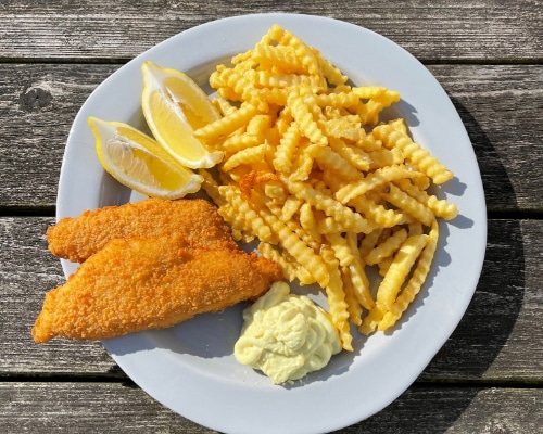 2 stk. RødspættefiletFriturestegte rødspættefileter (2 stk.) serveret med sprøde pommes frites, klassisk remoulade og en frisk citronskive til at give retten et syrligt pift.