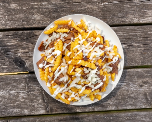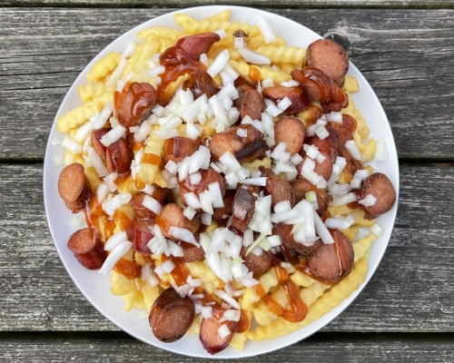 Sprøde pommes frites serveret med et blandet udvalg af grillpølser – direkte fra vores egen steger.