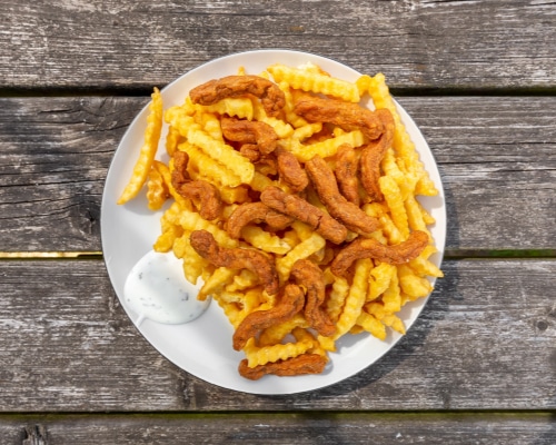 Lækre, sprøde nuggets med gyldne pomfritter og valgfri dip.