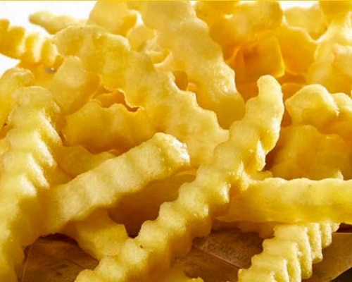 Sprøde pommes frites med saftige krydder kyllingestykker.