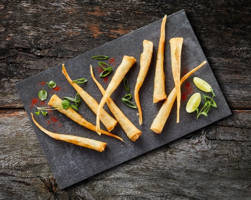 Reje twistersSmå, fine kræmmerhuse af filodej med fyld af varmvandsrejer, hvidløg, forårsløg og koriander. En blød kerne med en mild smag af østen i en sprød indpakning.