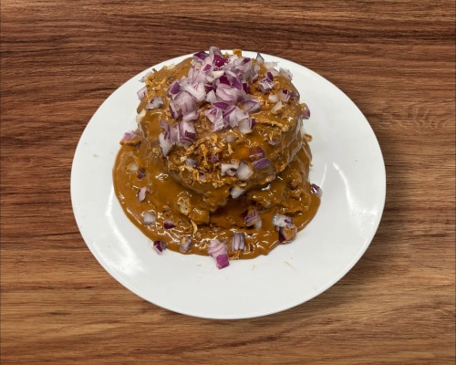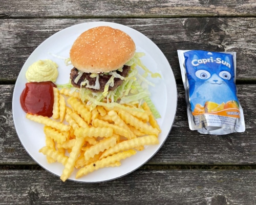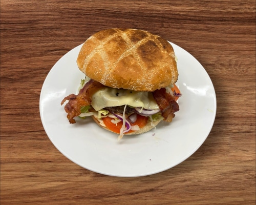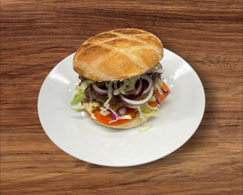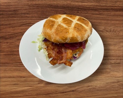 En saftig, hjemmelavet bøf i sprød bolle, smurt med ketchup, remoulade og sennep. Toppet med sprøde ristede løg og friske rå løg, samt lækre hjemmelavede bløde løg, agurkesalat og syrlige rødbeder. Alt sammen serveret med masser af cremet brun sovs – ren dansk komfortmad!